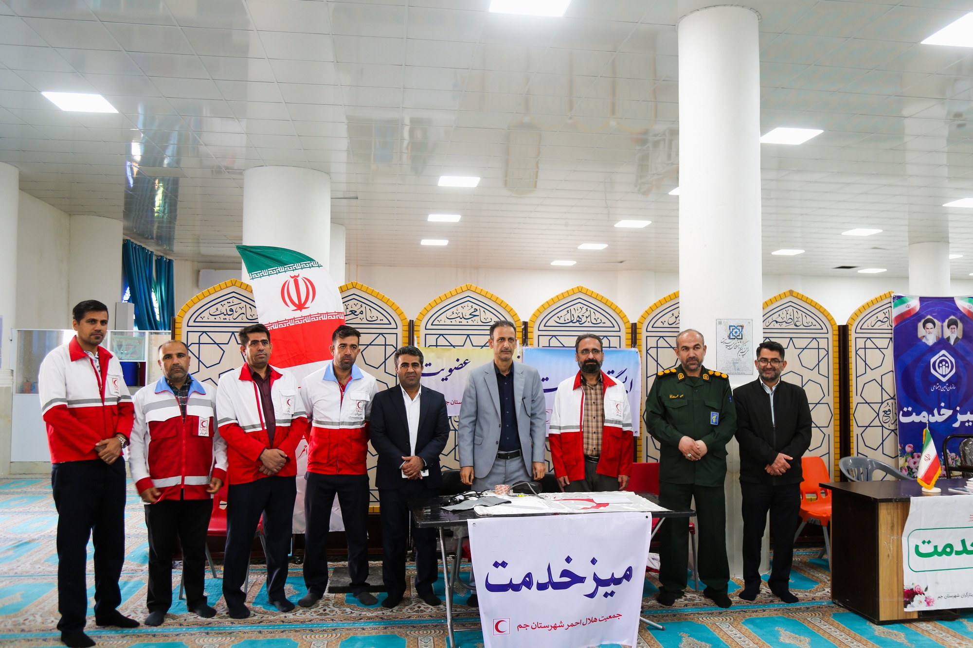 همزمان با ایام‌الله دهه مبارک فجر، میز خدمت دستگاه‌های اجرایی شهرستان جم با حضور فرماندار، مدیران ادارات و اقشار مختلف مردم در مصلی امام صادق(ع) شهر جم برگزار شد.
